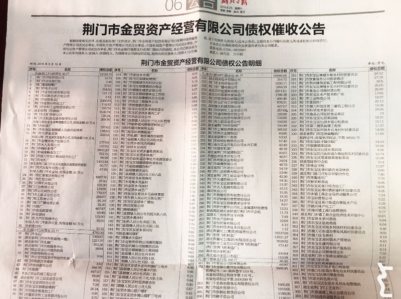 根據(jù)國(guó)家相關(guān)法律、法規(guī)及相關(guān)部門文件規(guī)定,為保障我公司債權(quán)的實(shí)現(xiàn),市中荊資產(chǎn)公司于2018年8月25日在湖北日?qǐng)?bào)分別刊登了《荊門市金貿(mào)資產(chǎn)經(jīng)營(yíng)有限公司債權(quán)催收公告》和《荊門市中荊資產(chǎn)經(jīng)營(yíng)有限公司債權(quán)催收公告》。通過媒體來催收債務(wù),有利于形成輿論監(jiān)督,督促債務(wù)人履行債務(wù),也有利于社會(huì)誠(chéng)信體系的建立。